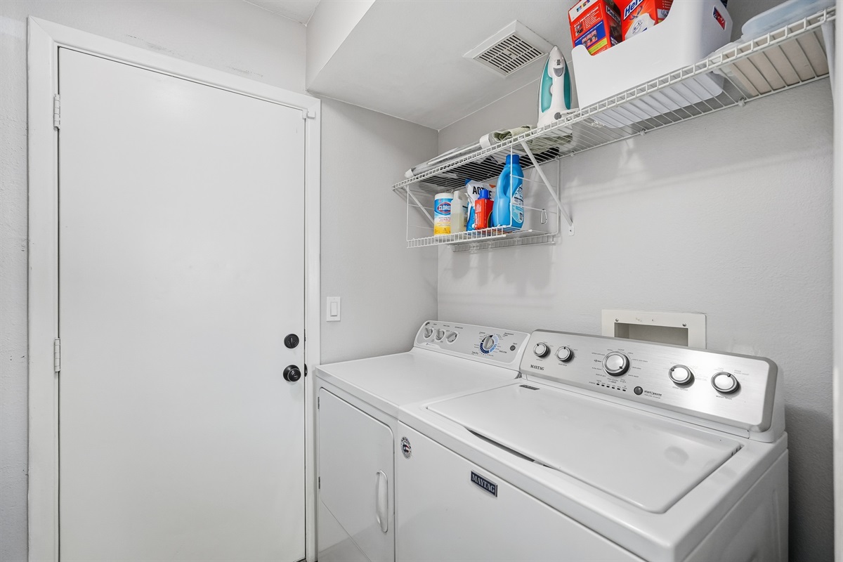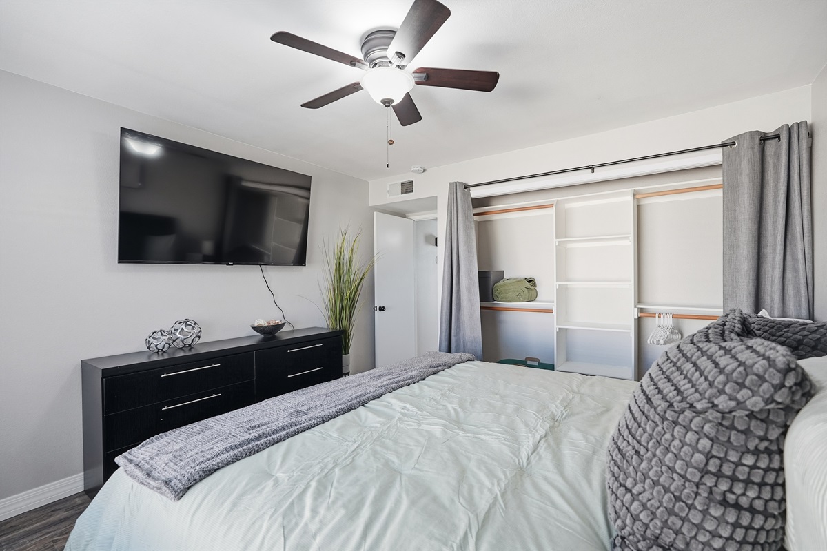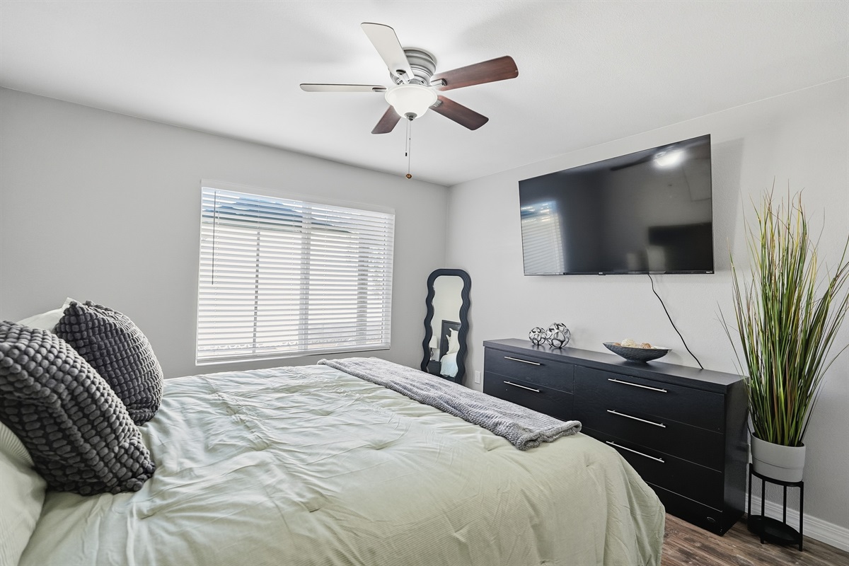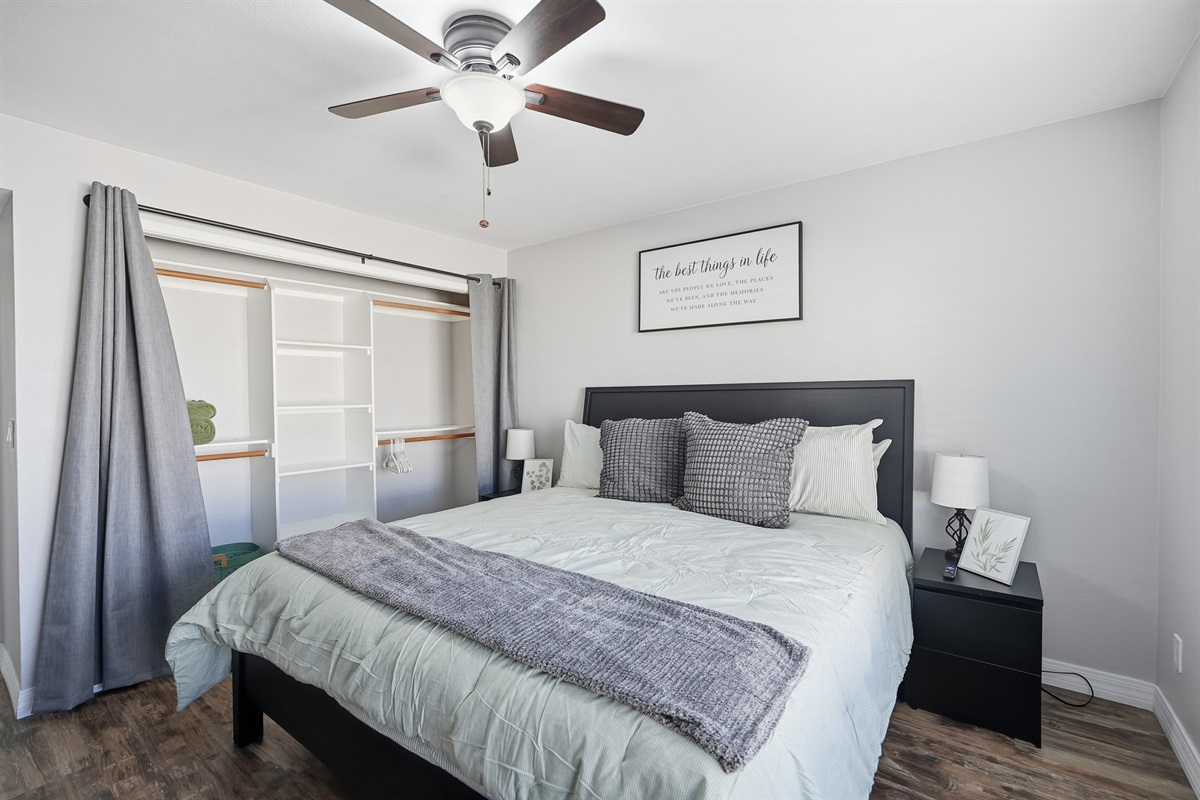 Master bedroom feature soft linens, ceiling fans, ample storage, and extra pillows and blankets to ensure a peaceful night’s sleep. For added convenience, enjoy the in-home washer and dryer.