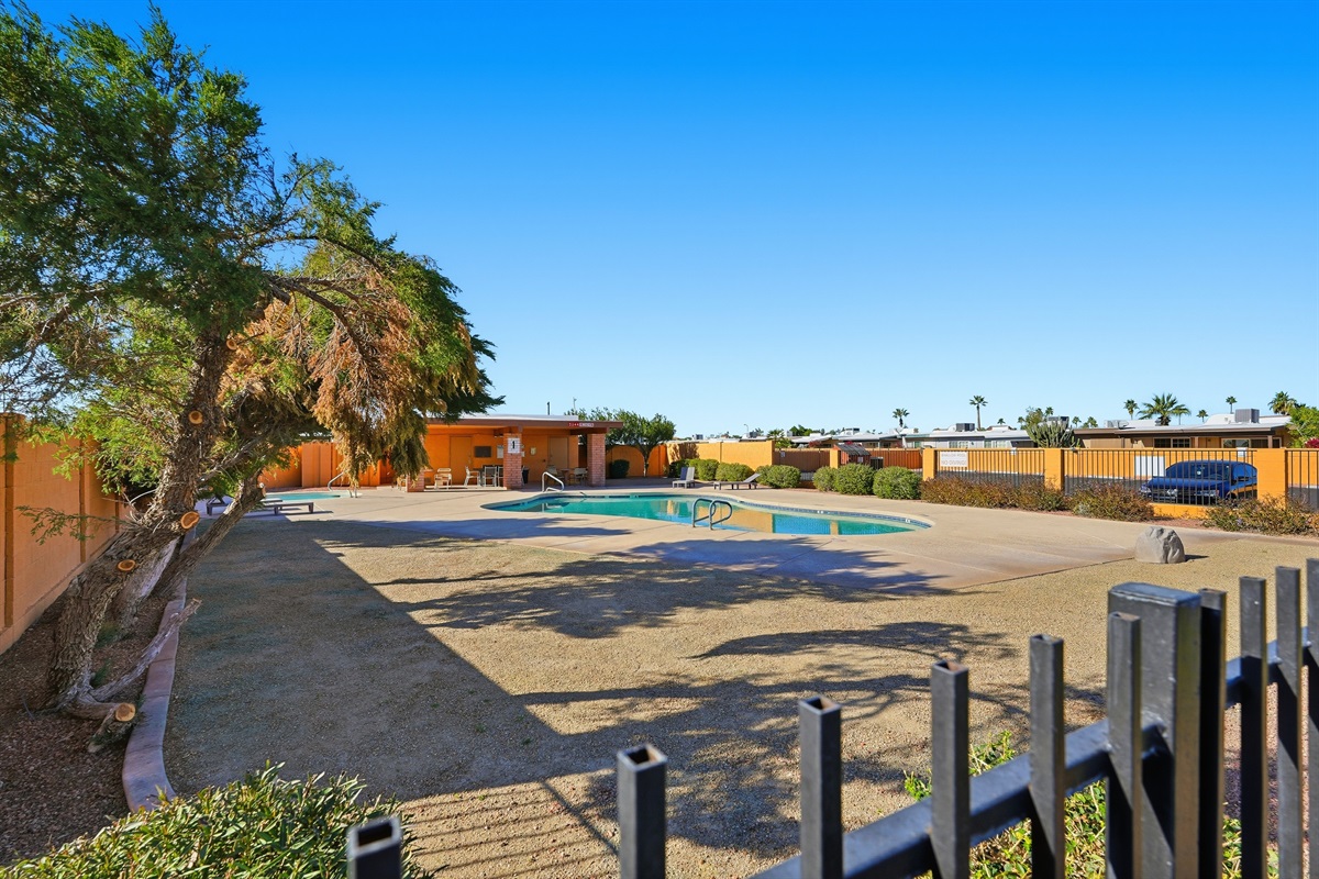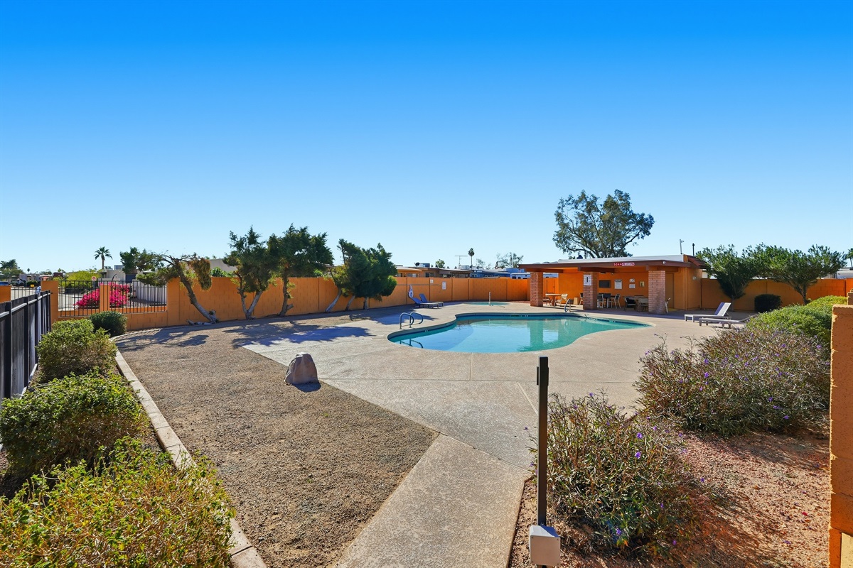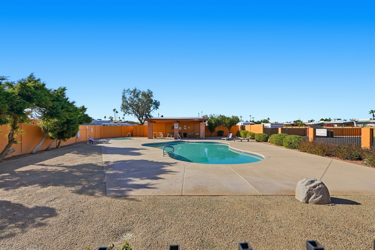 Guests also enjoy access to a heated community pool just 150 yards away, featuring comfortable lounge chairs and an inviting 8-ft deep end great for relaxing under the Arizona sun.