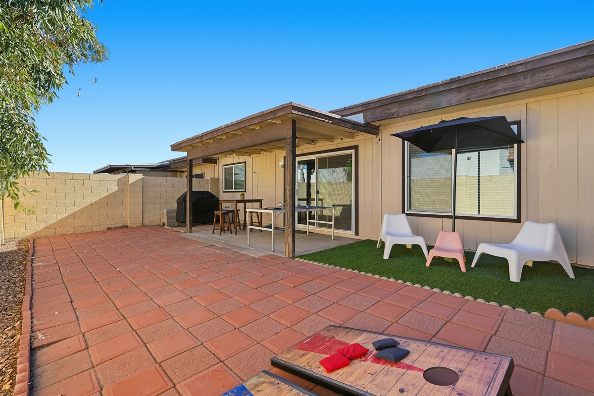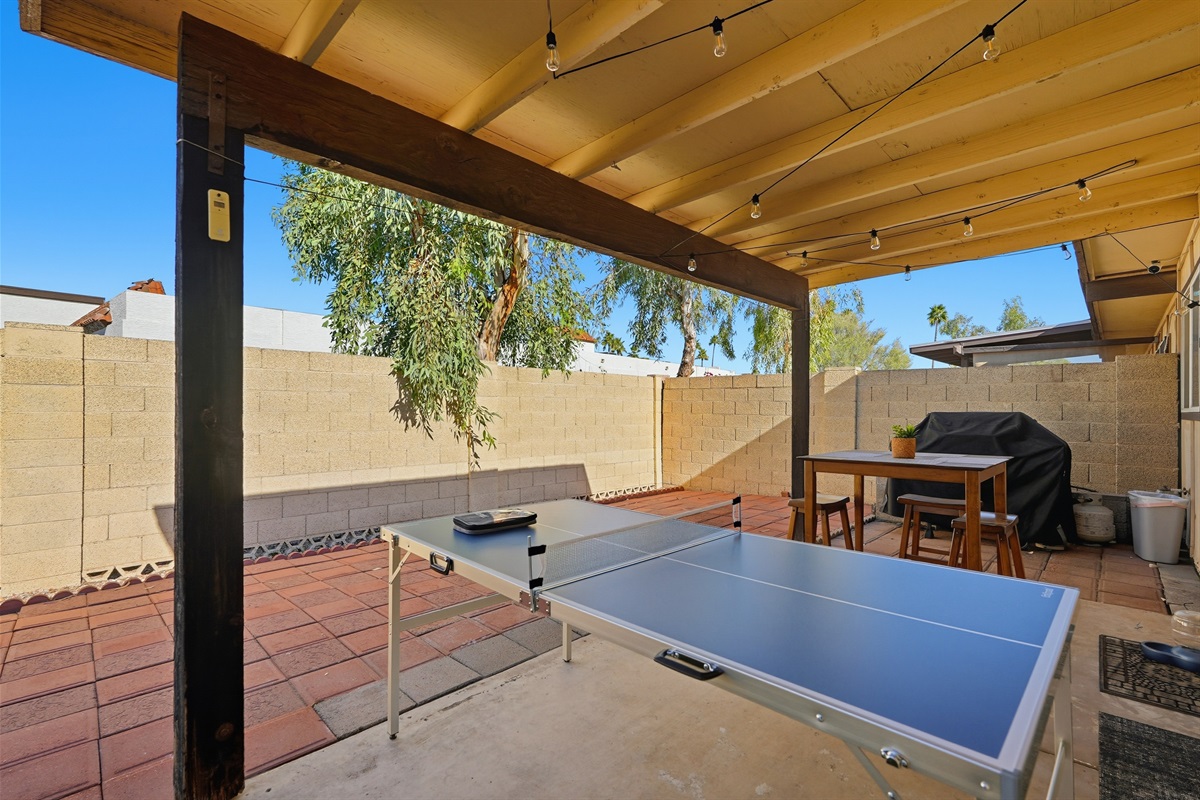 Head to the backyard, where you’ll find a propane grill, ping-pong table, cornhole game, and additional seating for outdoor fun and relaxation.