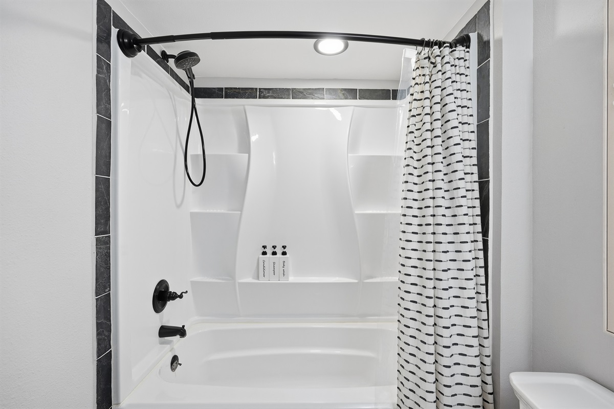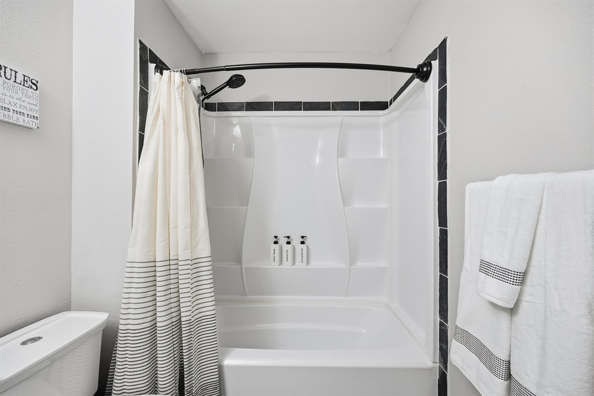 • second bathroom with tub and shower, warm tones, fresh linens, and everyday comforts.